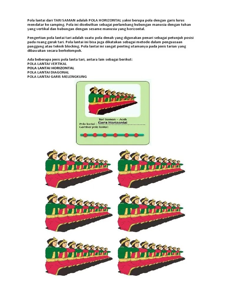 Tari Saman Daerah Asal Pola Lantai Dan Propertinya from awsimages.detik.net.id Liputan6.com, jakarta seni tari merupakan sebuah ekspresi jiwa dalam bentuk gerak yang diiringi dengan irama. Diagonal kemudian, pola lantai diagonal memiliki ciri khas bentuk garis menyudut ke kanan atau ke kiri. Ribuan warga yang terdiri dari masyarakat, seniman, pelajar, anggota tni, polri dan pns menampilkan tari saman massal di stadion seribu bukit, kabupaten gayo lues, aceh, senin (24/11). Pola lantai garis horizontal (menyamping) sangat sering digunakan dan menjadi dasar gerakan pada tari saman asal aceh ini. Maka, pola lantai yang lebih pas untuk tari saman adalah pola lantai horizontal yaitu berupa pola dengan garis lurus mendatar ke samping. Setiap tari tradisional terdiri atas penari yang melakukan tarian secara perorangan, berpasangan, atau berkelompok. Pola lantai ini sangat penting utamanya pada jenis tarian yang dibawakan secara berkelompok. Pola lantai adalah pola denah arah gerakan yang dilakukan oleh para penari.